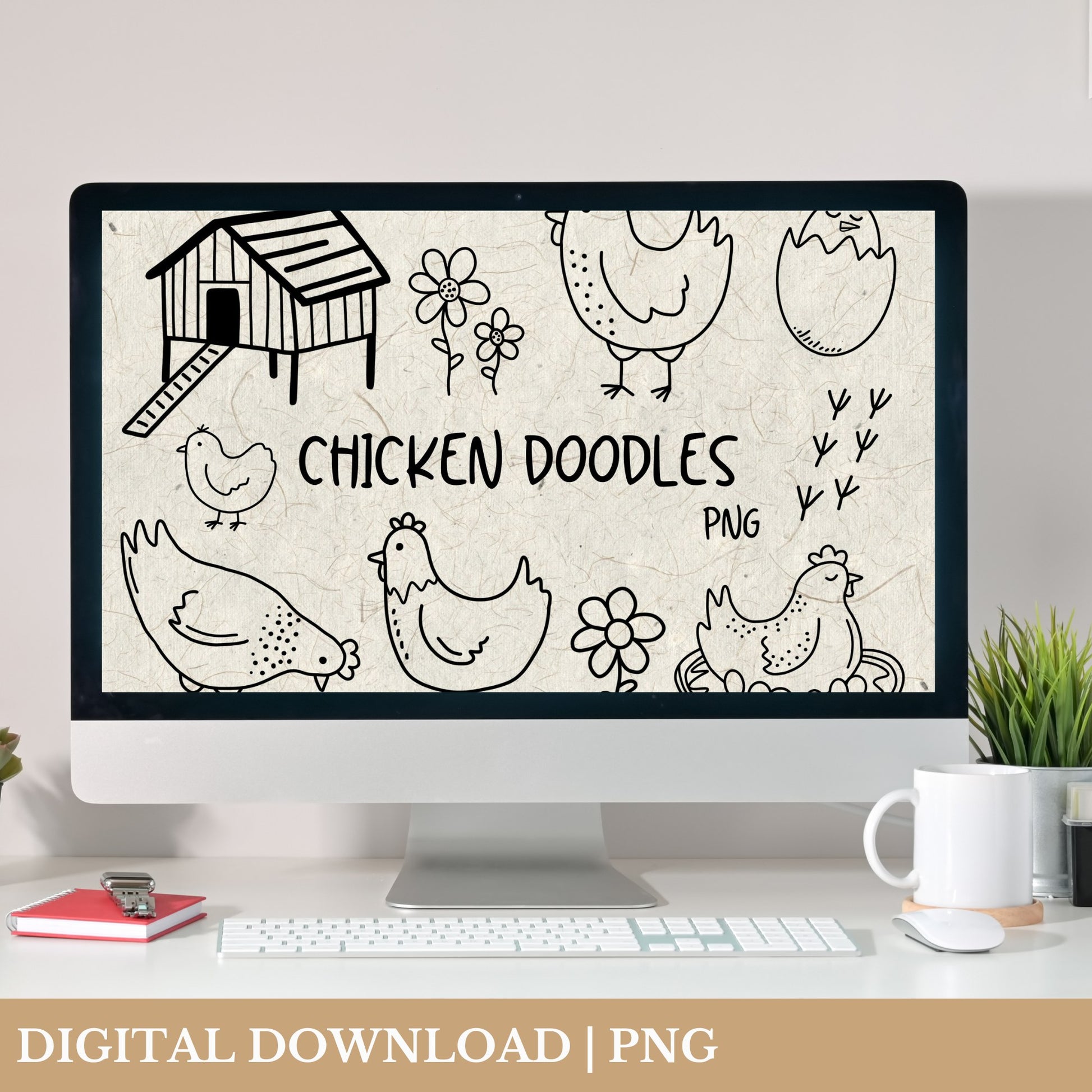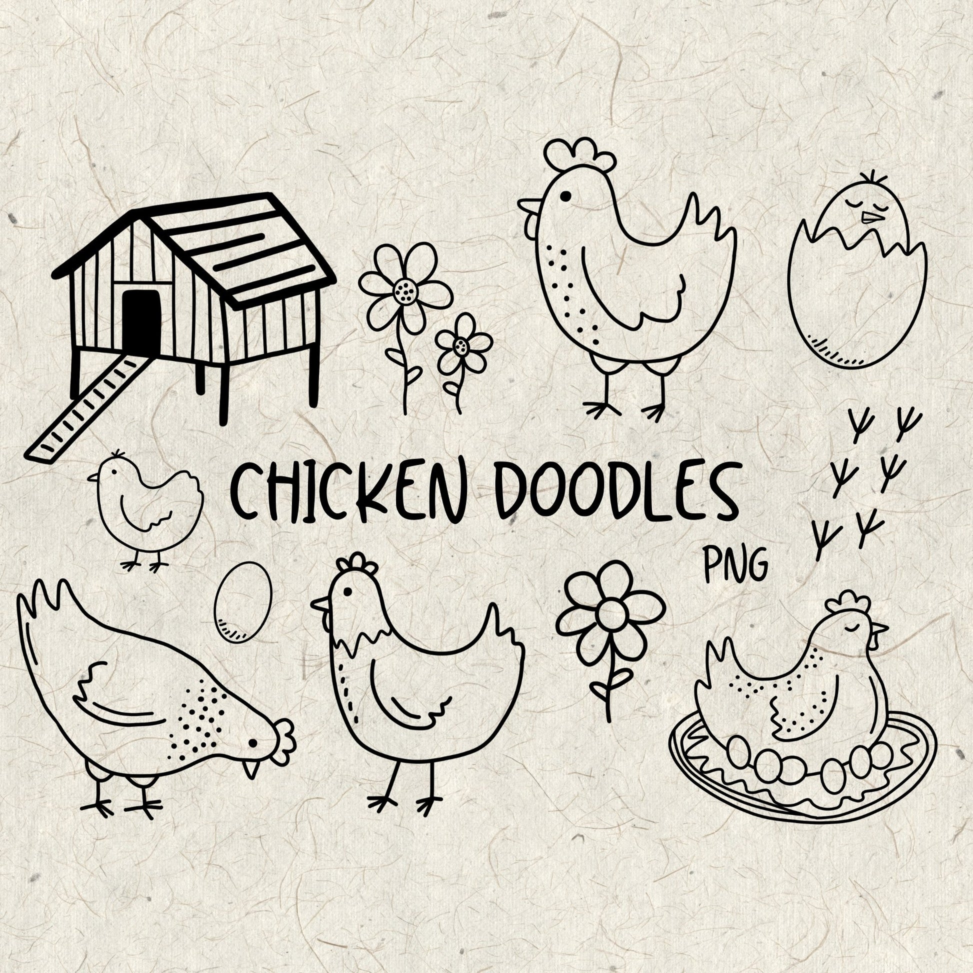 This doodles design includes 11 separate drawings related to chickens such as; 4 hens, 2 chicks, a chicken coop, two flowers, an egg, and chicken foot prints.