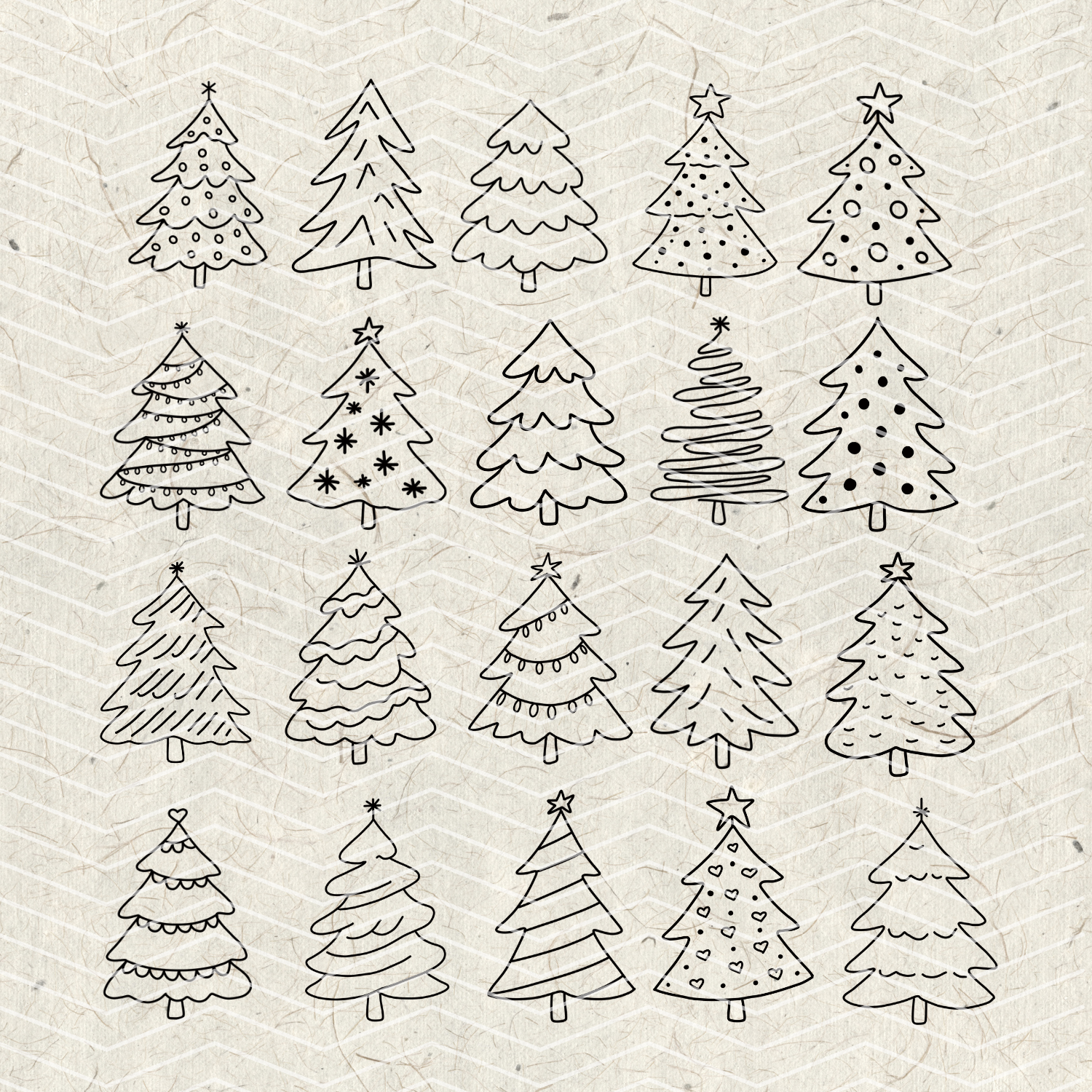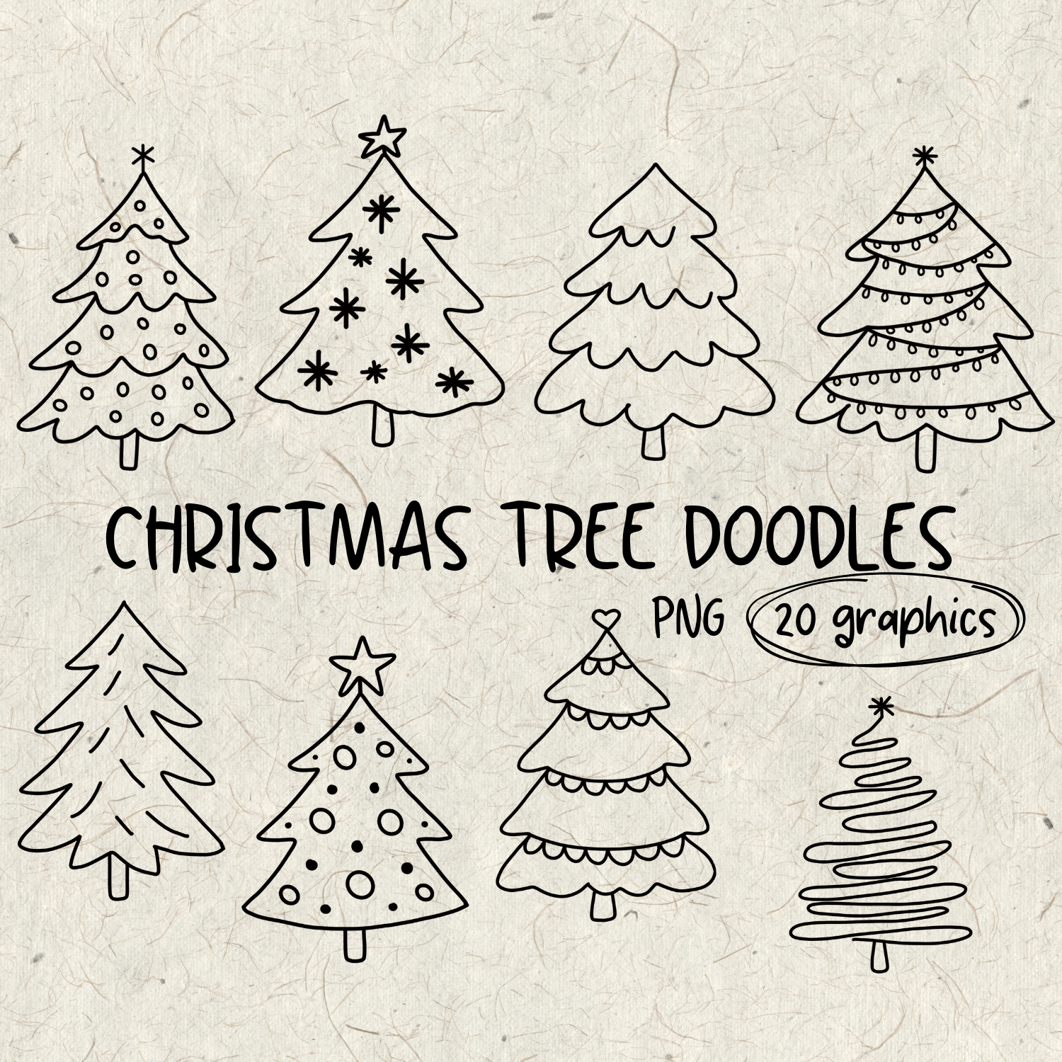 This doodle design includes 20 separate Christmas tree drawings. Each graphic is created by hand and saved with a transparent background, making them perfect for layering, resizing, and customizing.