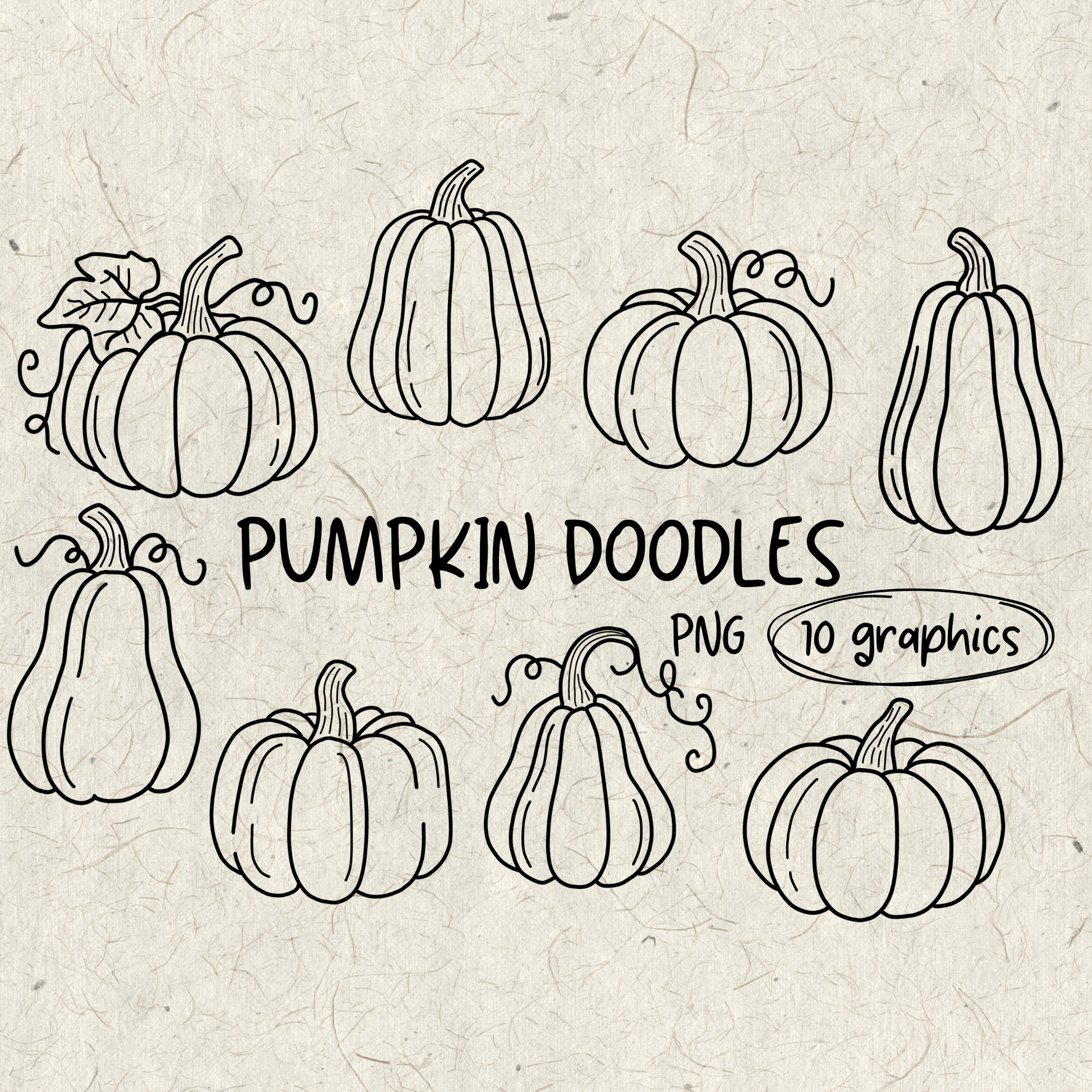 This doodle design includes 10 separate fall pumpkin drawings. Each graphic is created by hand and saved with a transparent background, making them perfect for layering, resizing, and customizing.