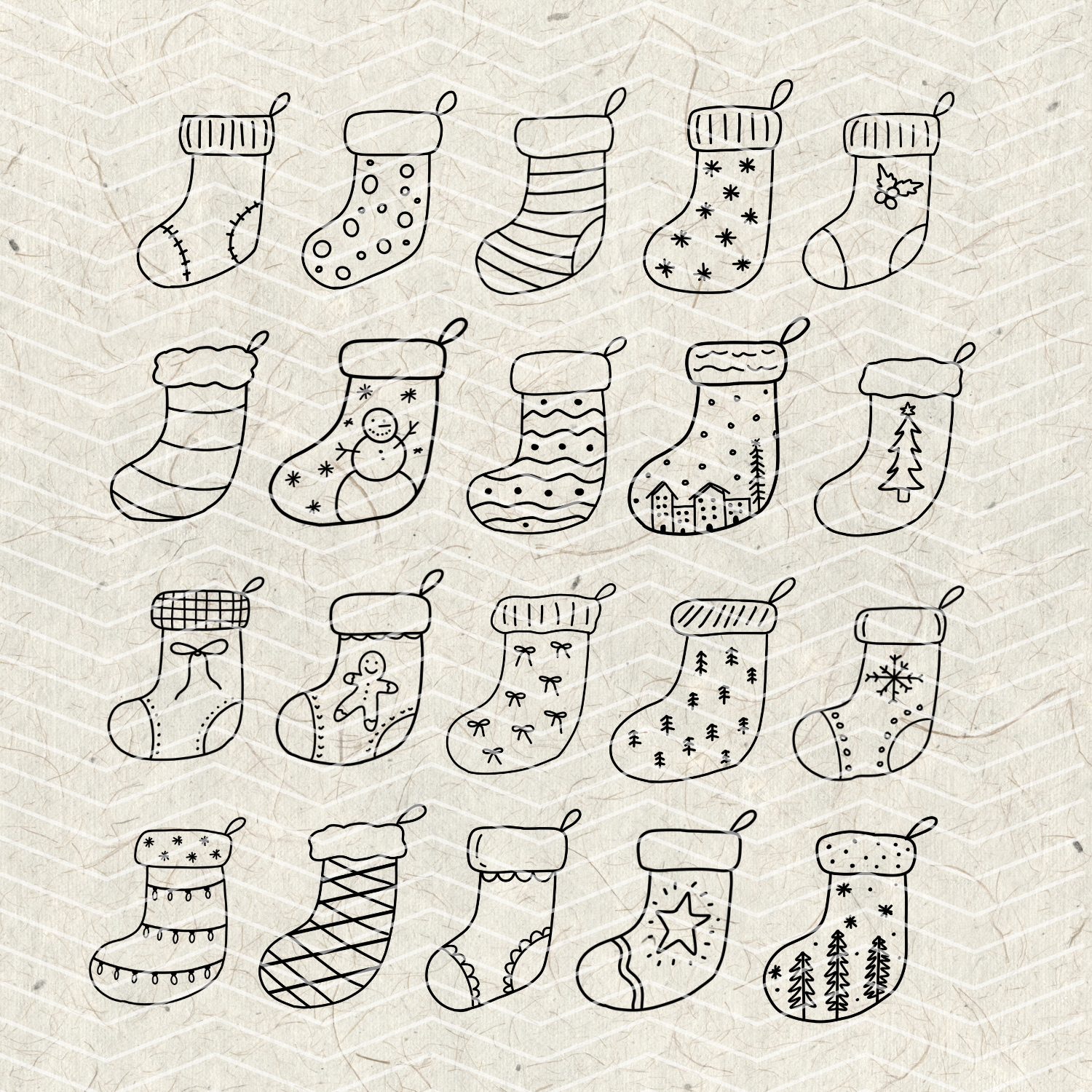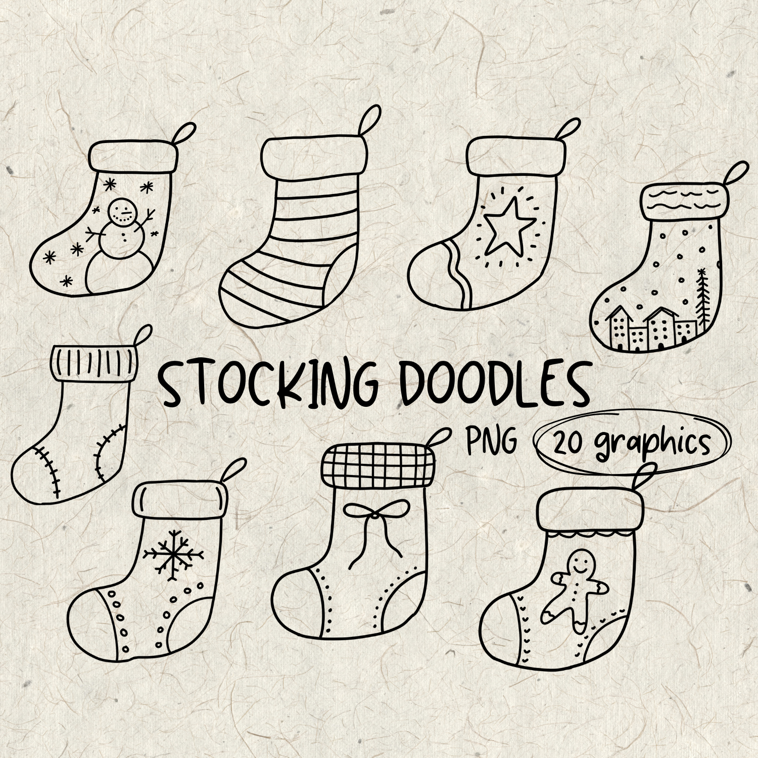 This doodle design includes 20 separate Christmas stocking drawings. Each graphic is created by hand and saved with a transparent background, making them perfect for layering, resizing, and customizing.