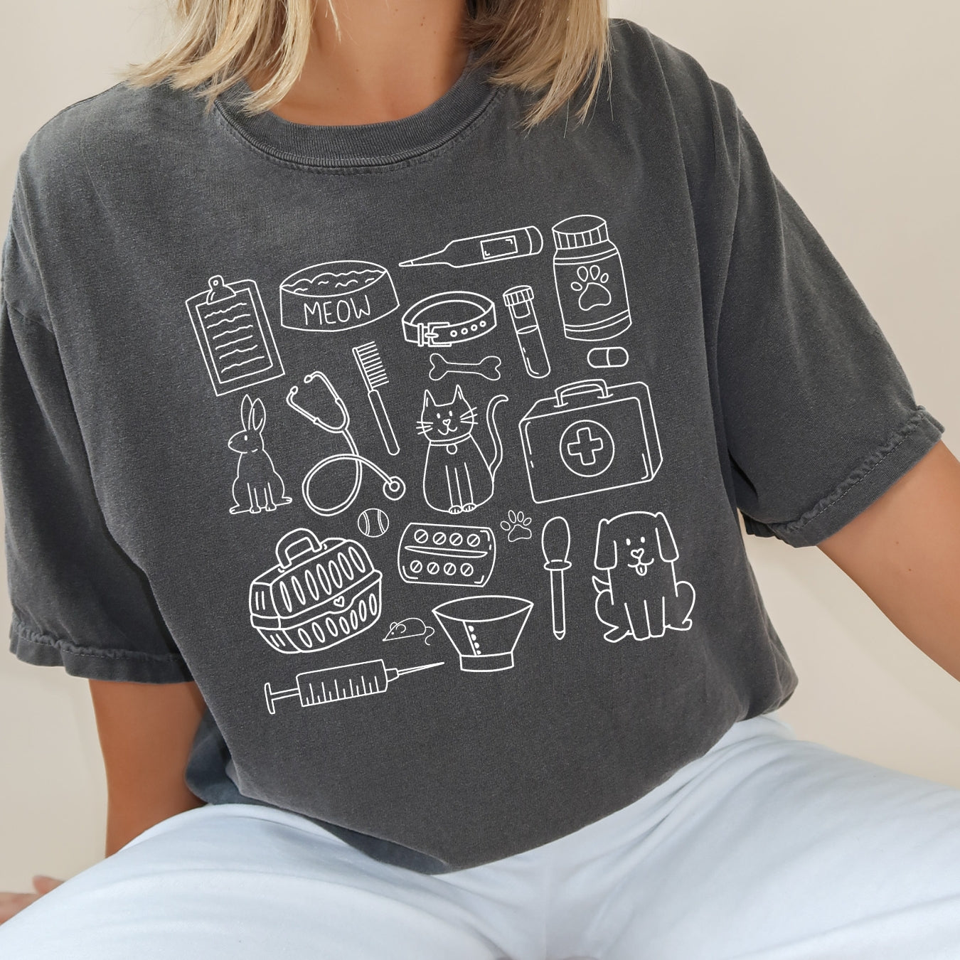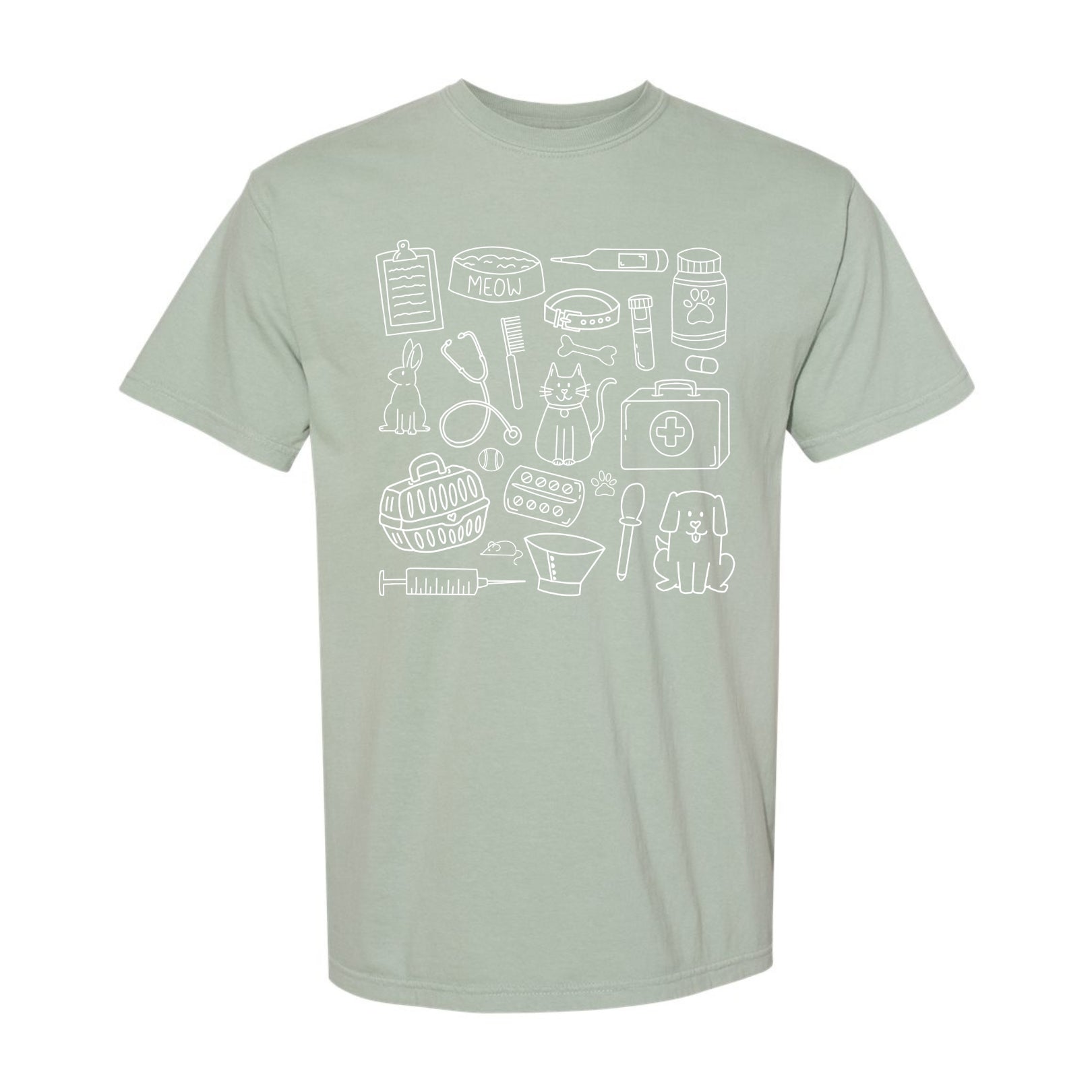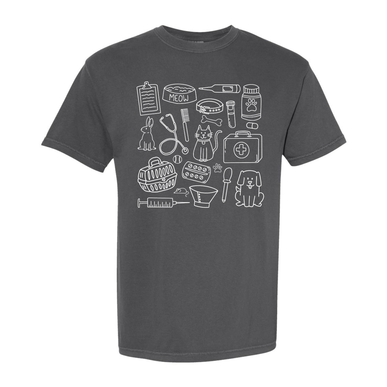 This t-shirt features our hand-drawn Veterinary Doodles design on the front. Perfect for veterinarians, vet techs, and anyone in the animal healthcare field!