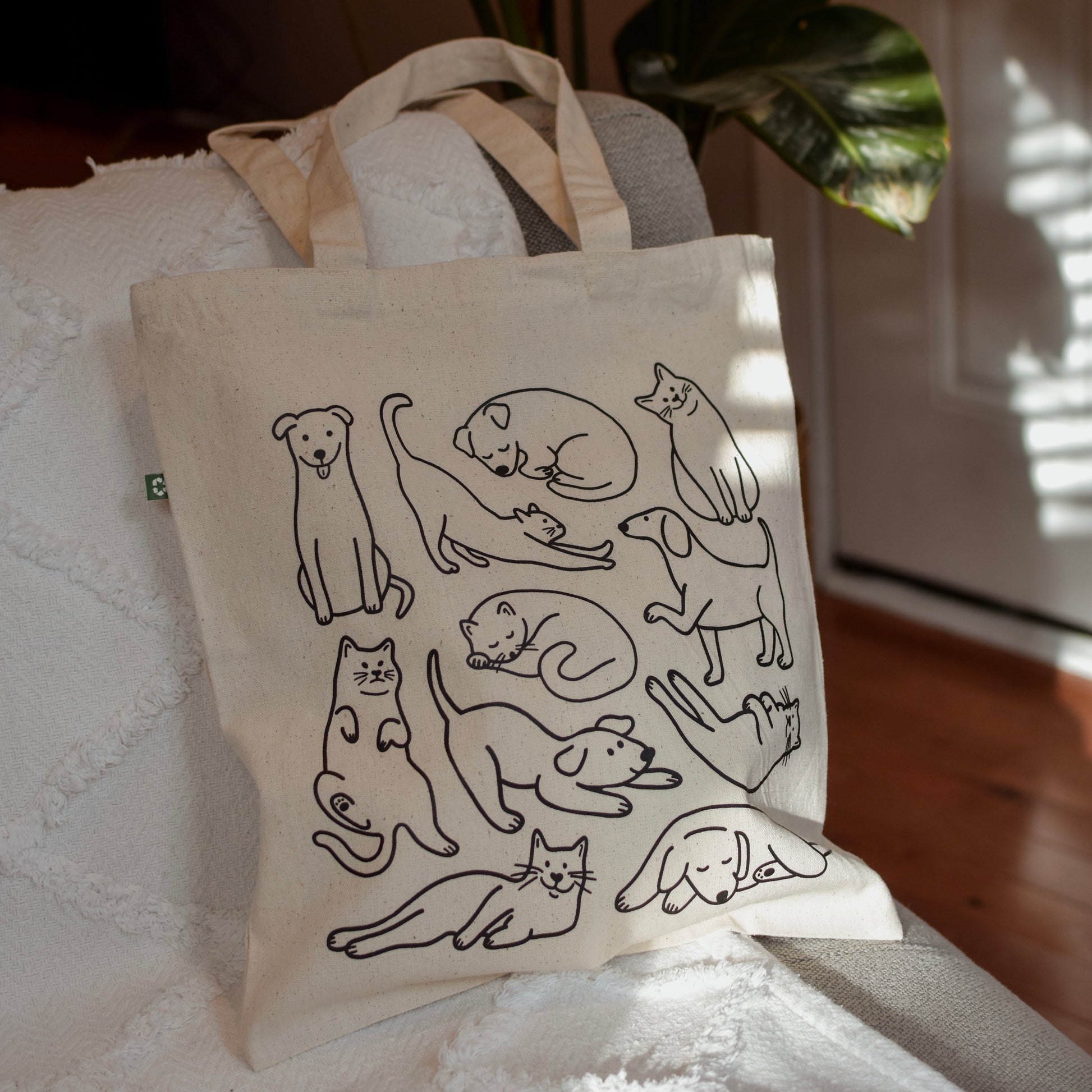 Say bye to plastics! These dog & cat doodle totes are the perfect environmentally friendly reusable bag. Great for post office runs, farmers markets, bookstores, school, shopping and more! With reinforced stress points, this bag can withstand the wear and tear of daily use. Crafted from recycled cotton, these totes are sustainable, functional, and adorable!