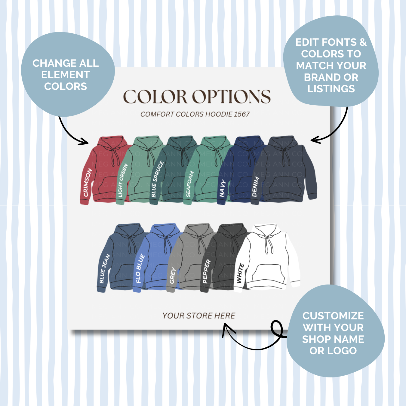 Editable Comfort Color Hoodie 1567 color chart template — customizable in Canva and perfect for t-shirt business owners and Etsy sellers!