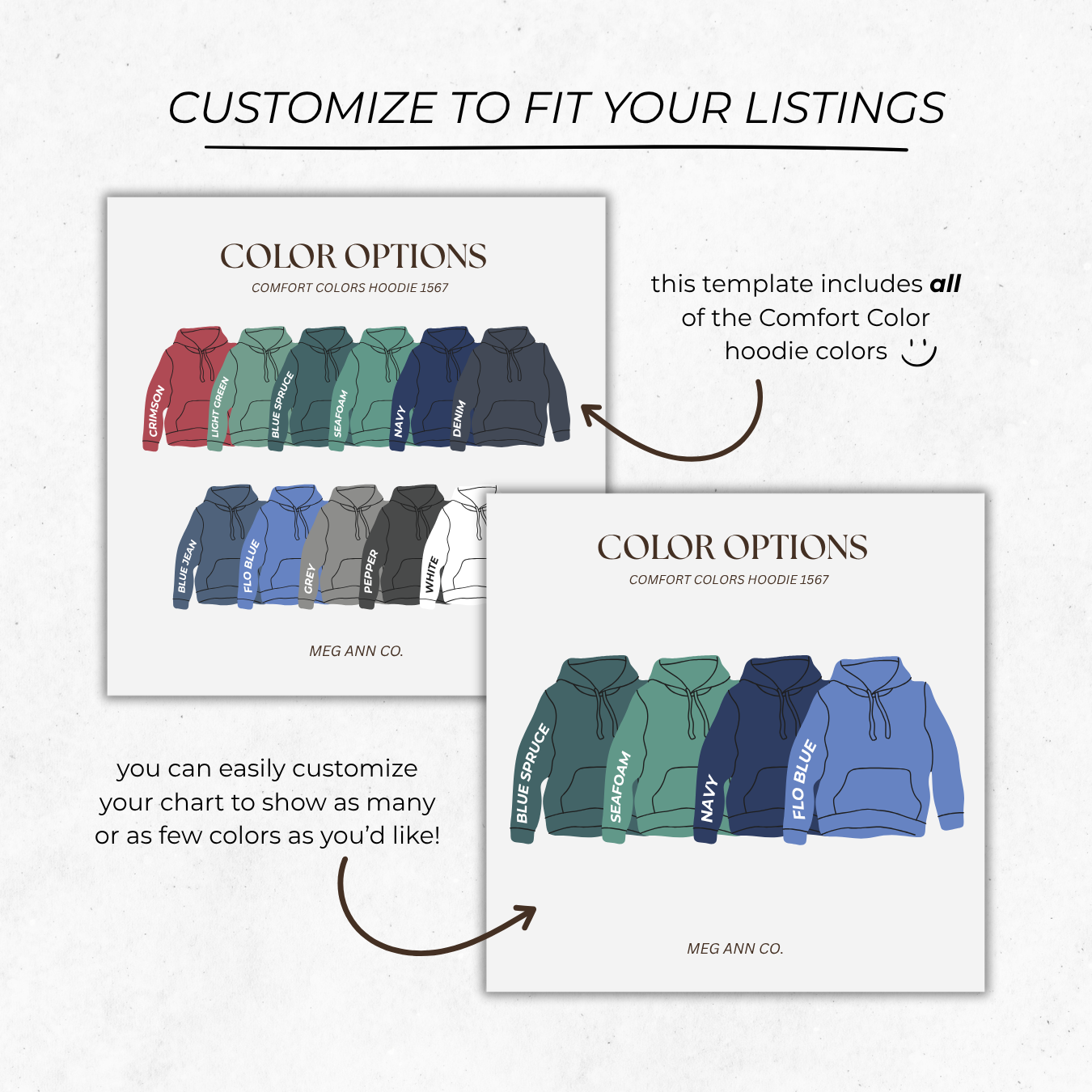 You will receive a link to access a fully editable Canva template. With this template, you can easily customize it by adding your store name, adjusting fonts, changing layouts, and editing the design to match your brand. The chart comes with all Comfort Color Hoodie 1567 shades, and you can add or remove colors to create the perfect chart for your shop. Once finished, download your chart with no watermark and upload it directly to your listings!
