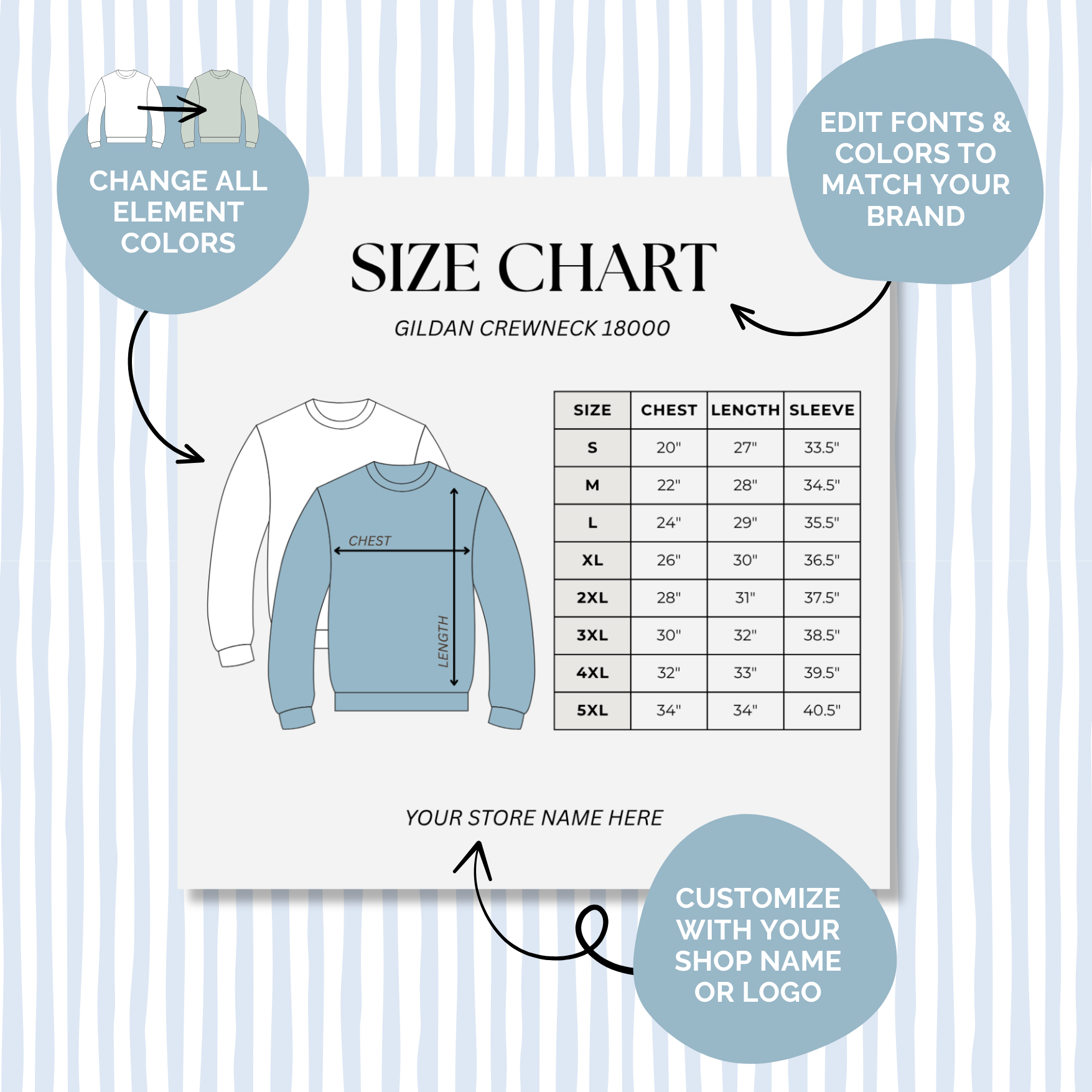 Editable Gildan Crewneck 18000 size chart template—customizable in Canva and perfect for t-shirt business owners and Etsy sellers!