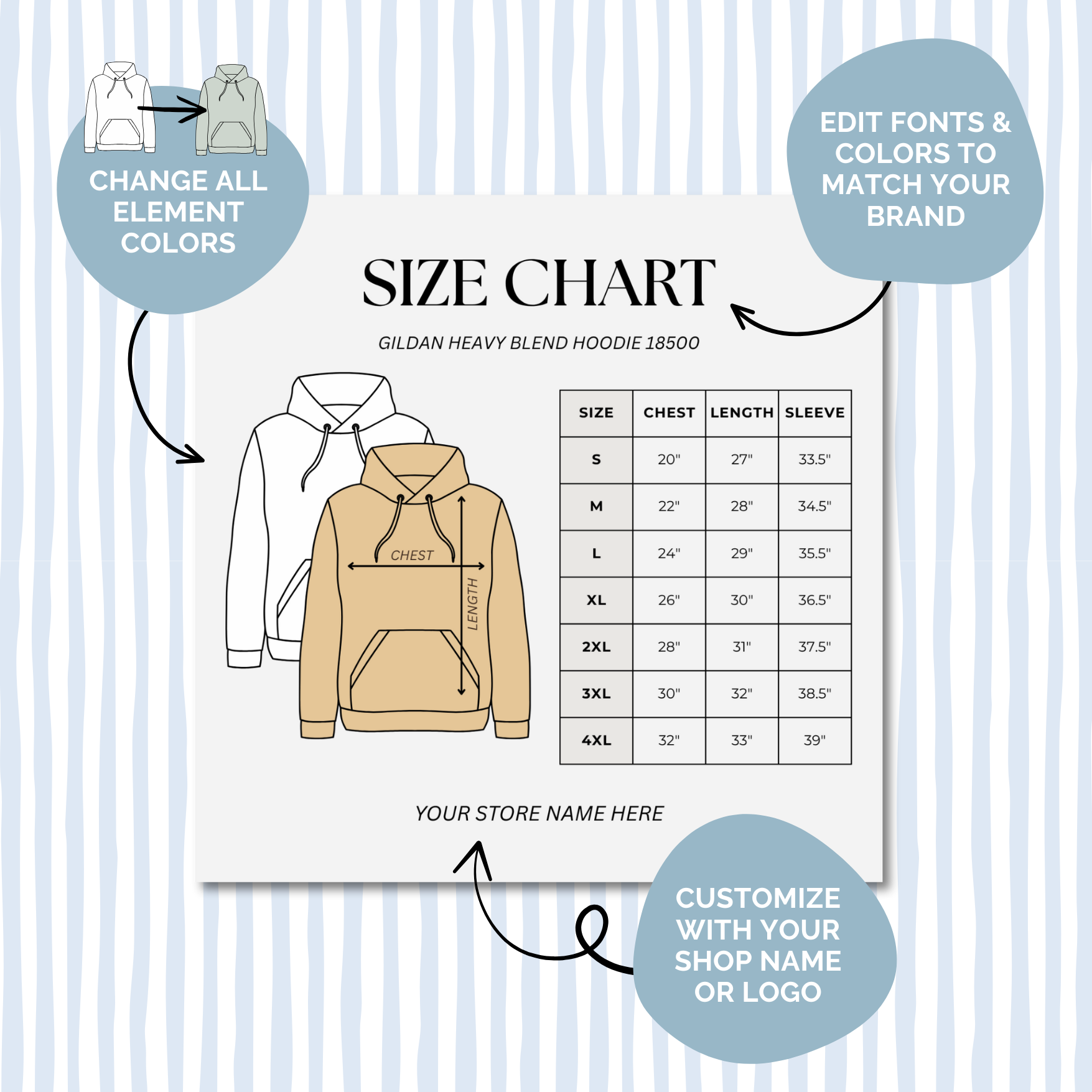 Editable Gildan 18500 sweatshirt hoodie size chart template—customizable in Canva and perfect for t-shirt business owners and Etsy sellers!