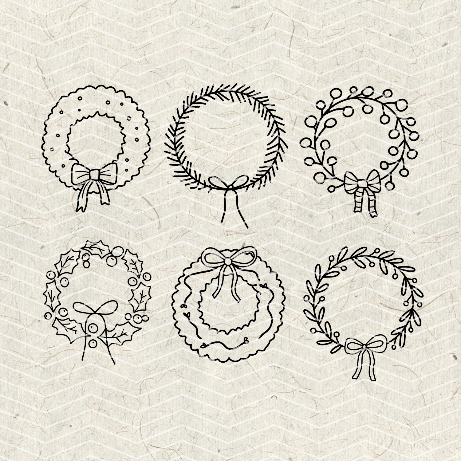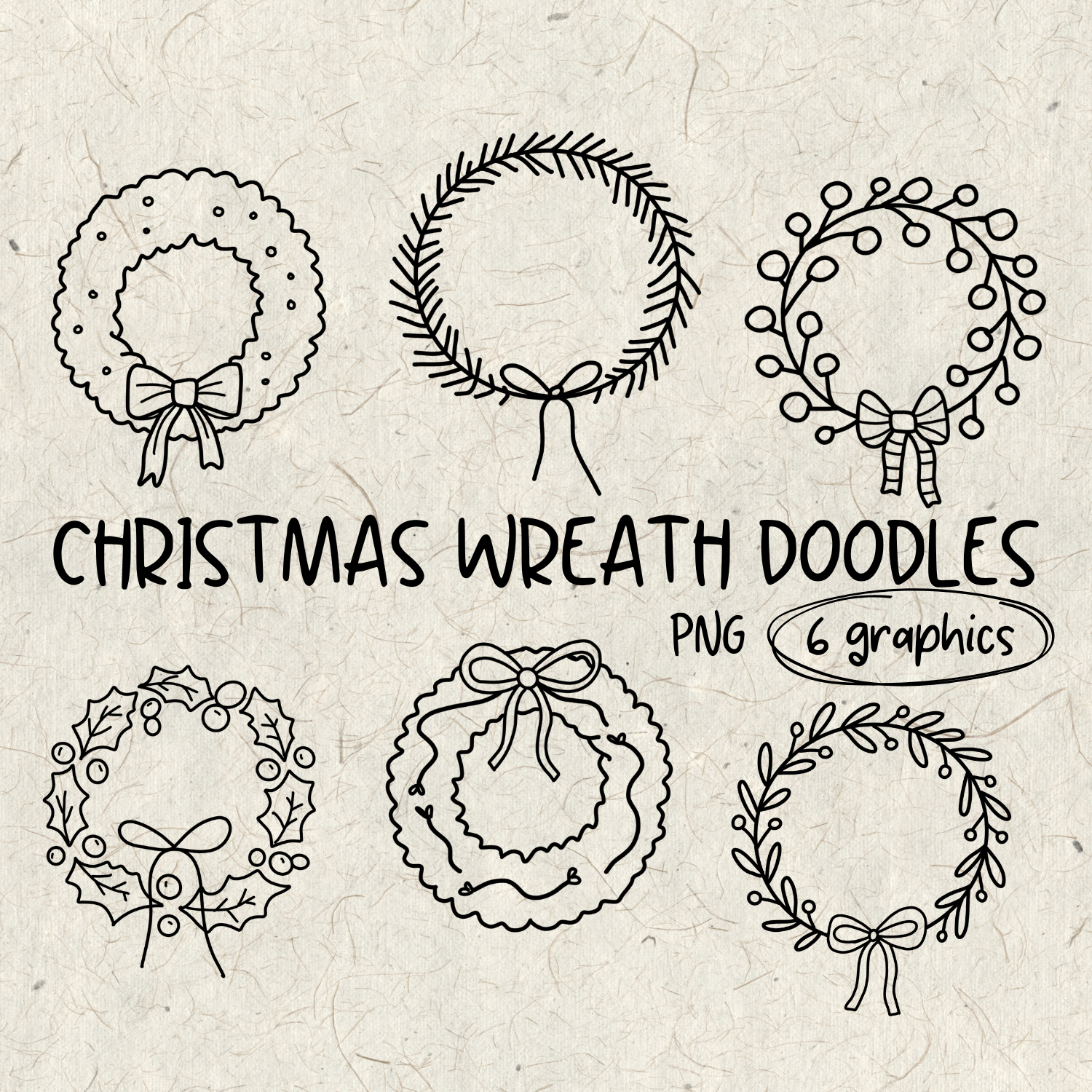 This doodle design includes 6 separate Christmas wreath drawings. Each graphic is created by hand and saved with a transparent background, making them perfect for layering, resizing, and customizing.
