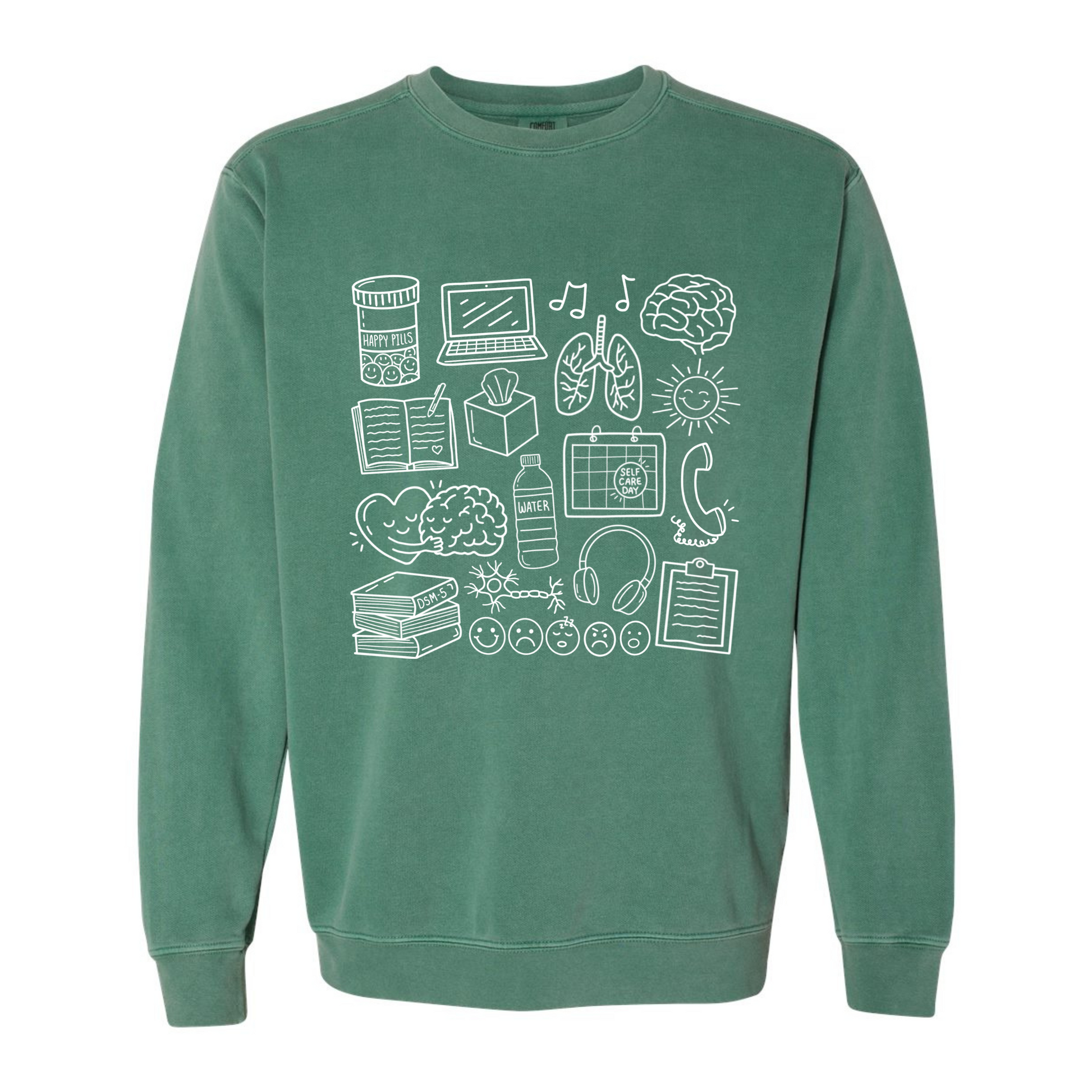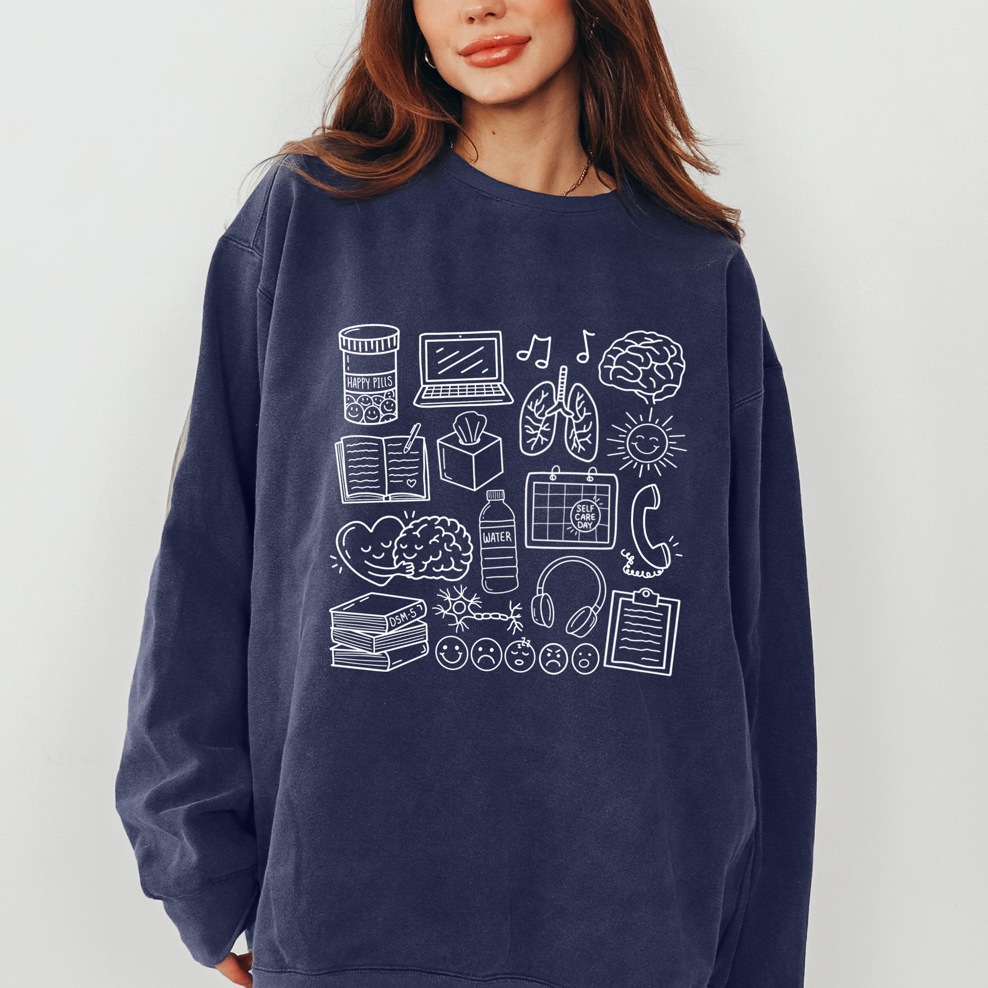 This crewneck features our hand-drawn mental health design on the front. Perfect for therapists, counselors, social workers, and mental health advocates.