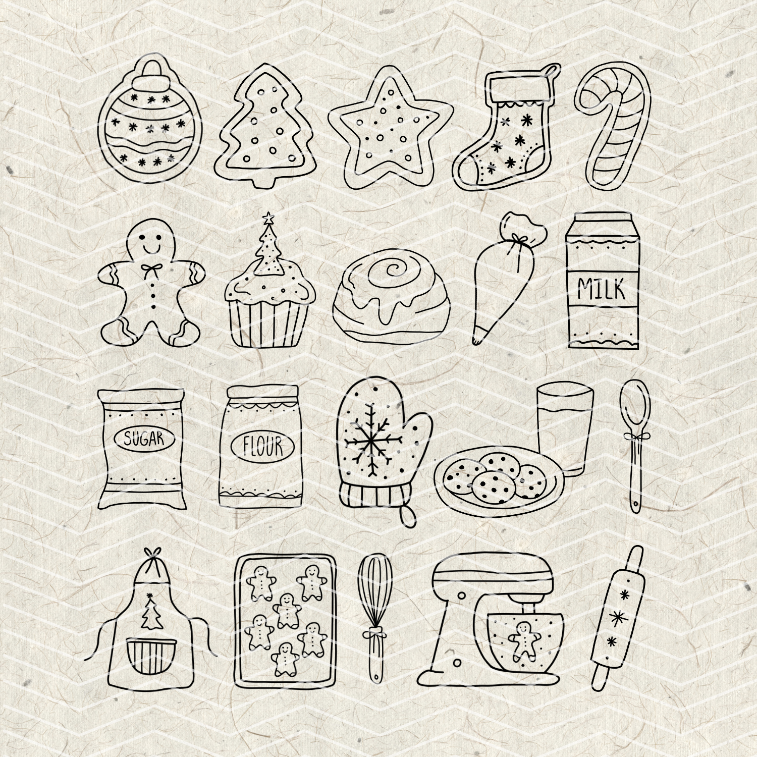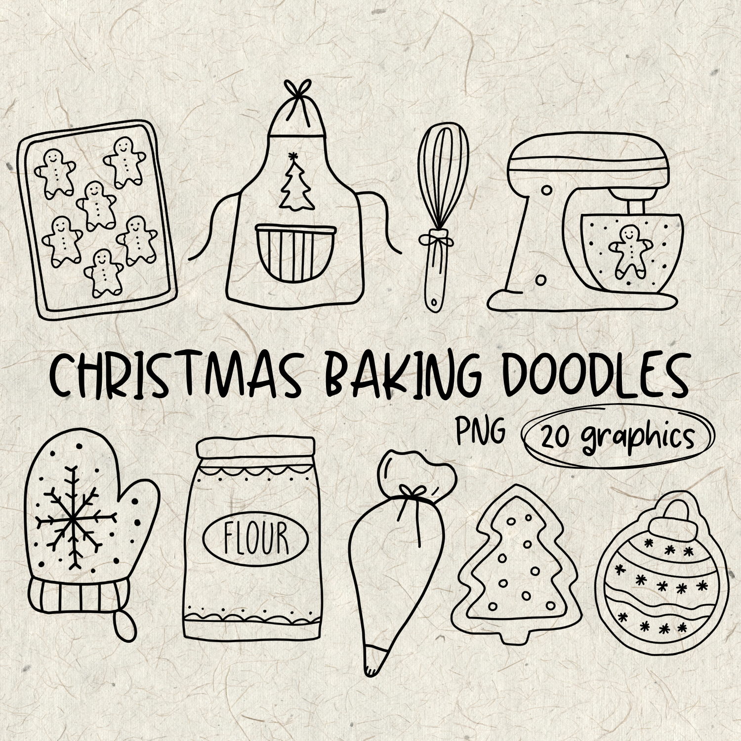 This doodle design includes 20 separate Christmas baking drawings, including six cookie doodles, a kitchen mixer, an apron, a gingerbread man, a rolling pin, a frosting bag, a whisk, cookies and milk for Santa, a wooden spoon, a cinnamon roll, a cupcake, a bag of flour and sugar, a gallon of milk, and a sheet of gingerbread cookies.