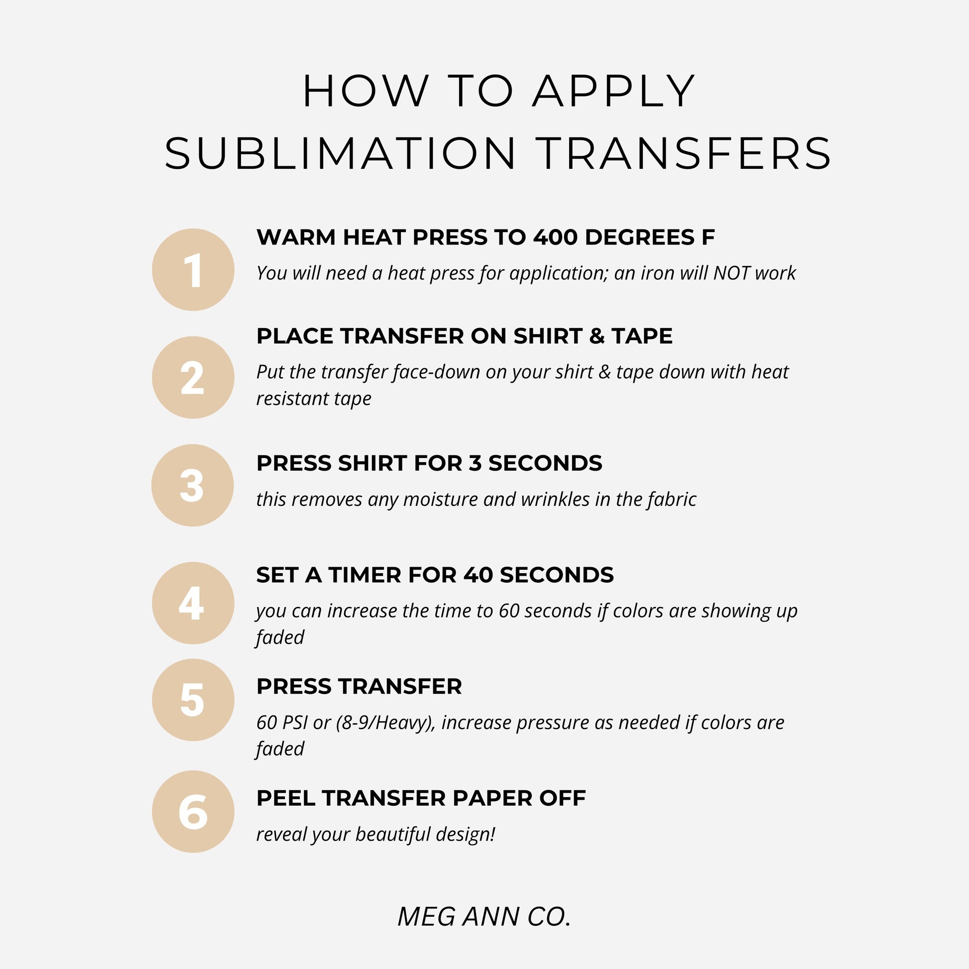 *All sublimation transfers are non-refundable due to their nature and the potential for improper application. If you experience any issues or have questions regarding your order, please reach out to helpmegannco@gmail.com for assistance.