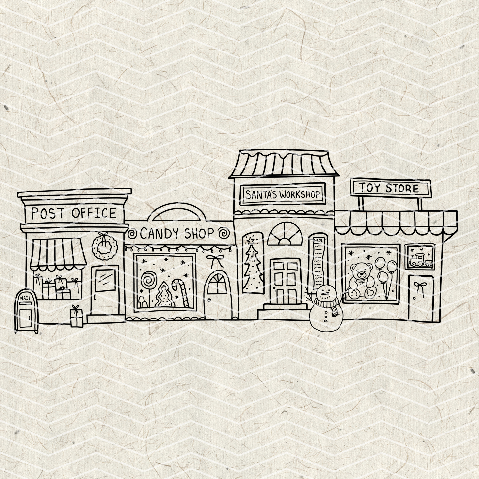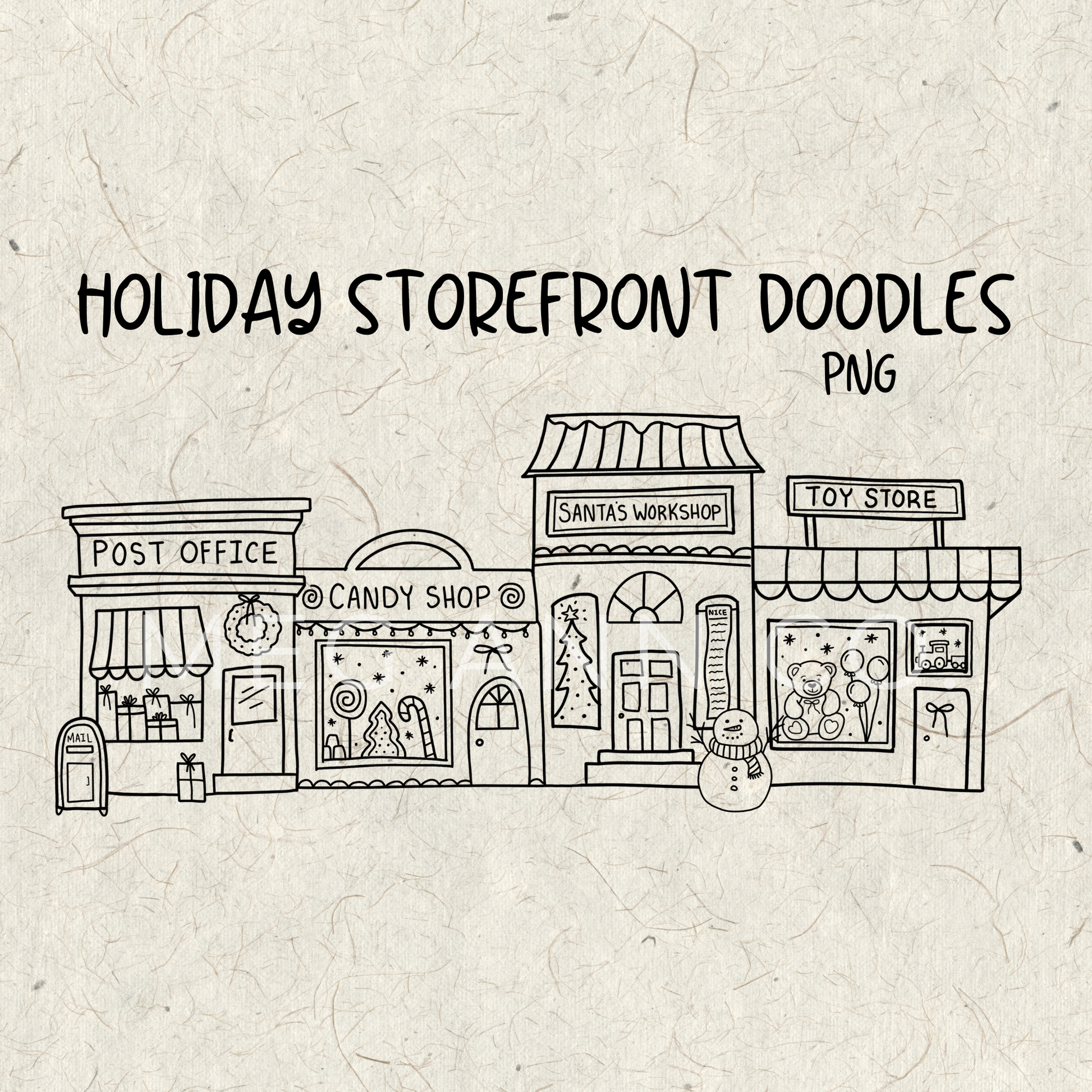 This doodle design includes one PNG file with four Christmas storefront drawings — a post office, a candy shop, Santa's Workshop, and a toy store. This graphic is hand-drawn and saved with a transparent background, making it perfect for layering, resizing, and customizing.