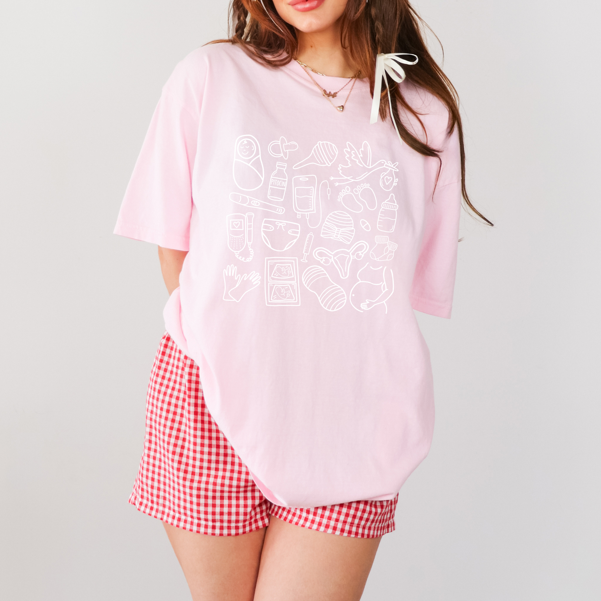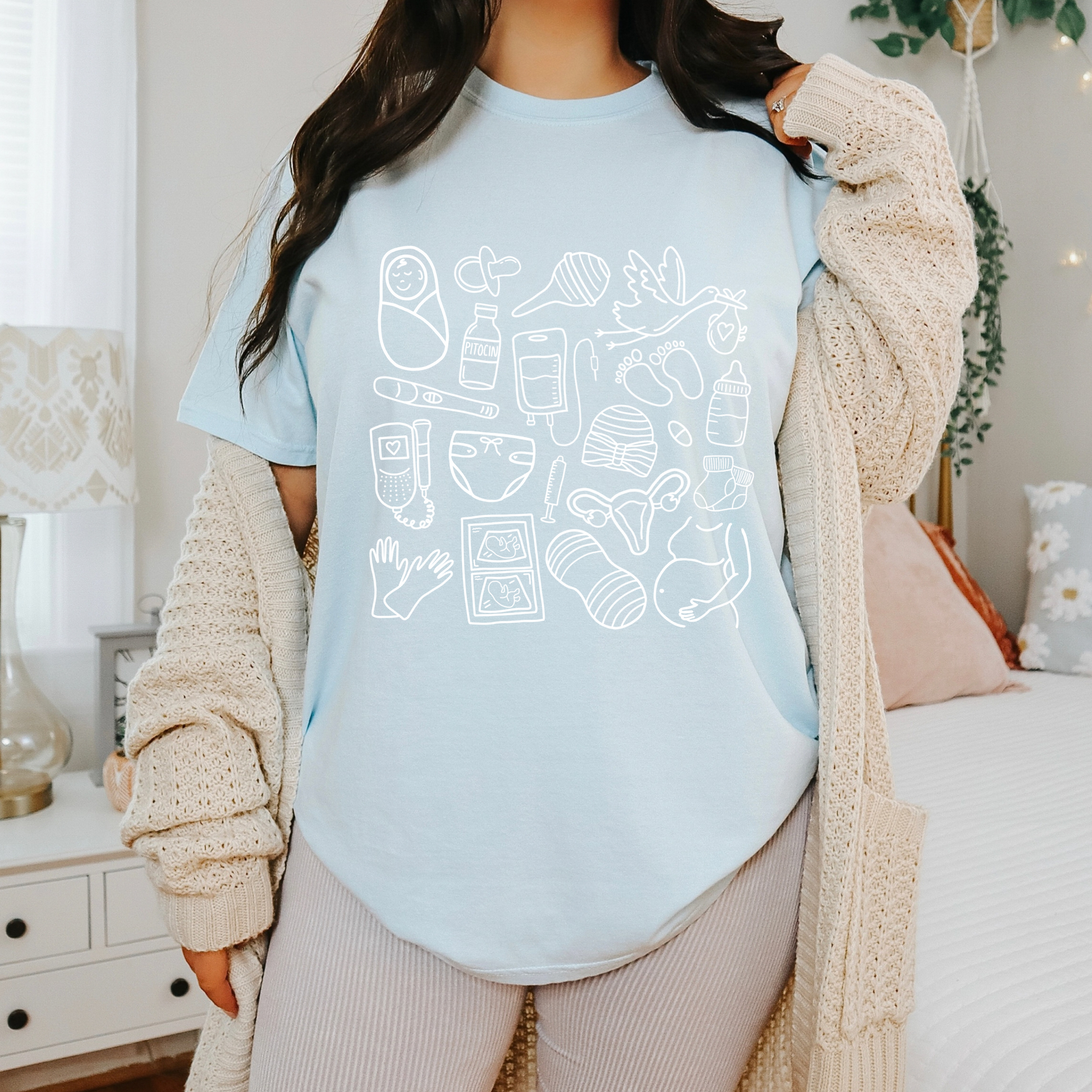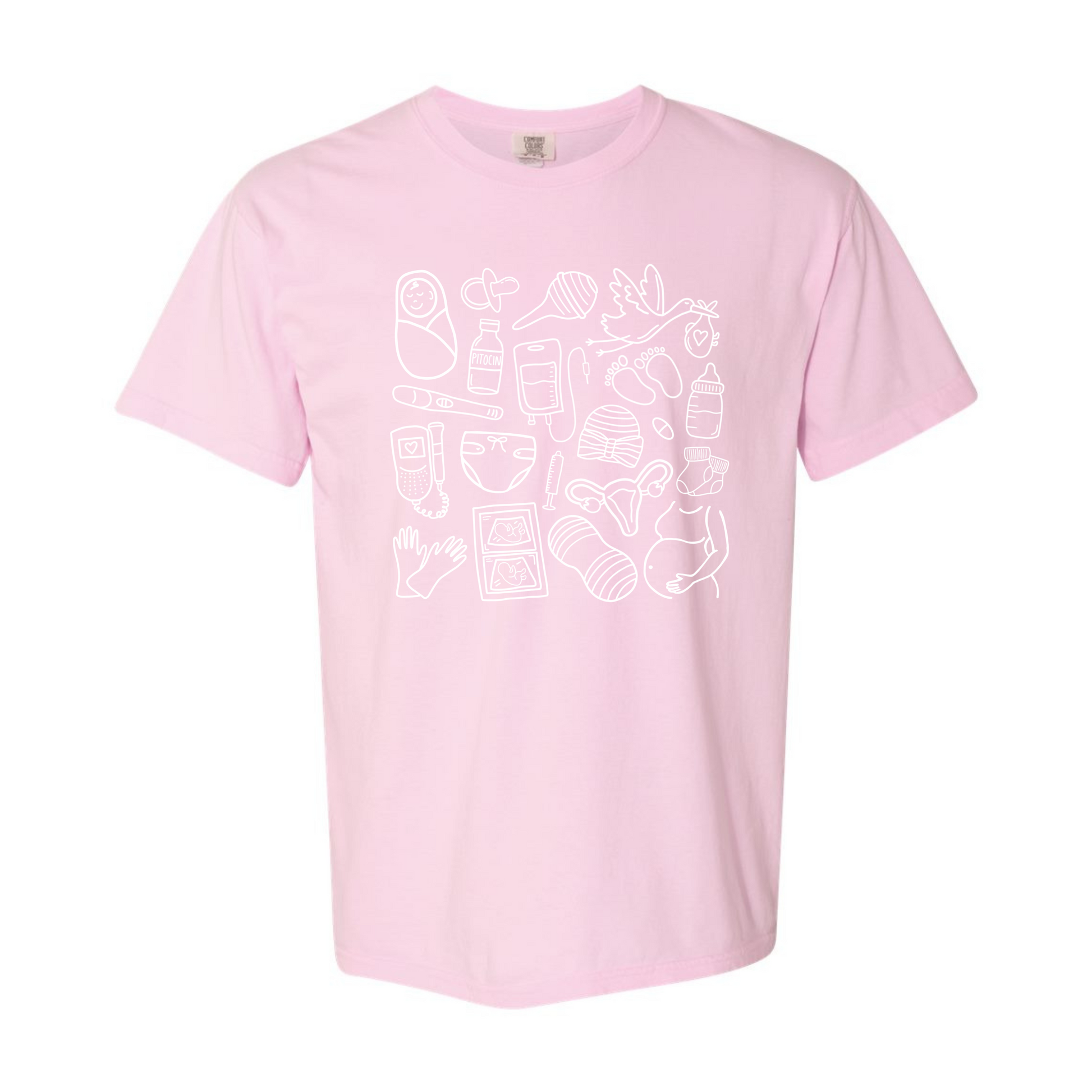 This t-shirt features our hand-drawn Labor & Delivery Doodles design on the front, making it perfect for all L&D nurses, OBGYNs, mom/baby nurses, or other healthcare professionals!